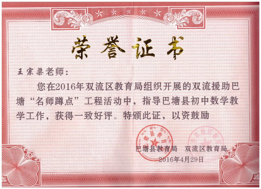 王宗渠老师参加的本次支教活动是双流区教育局组织开展的双流援助巴塘“名师蹲点”工程活动,她积极指导巴塘县初中数学教学工作,推广了我校自主合作探究式课堂教学模式研究成果,获得一致好评。