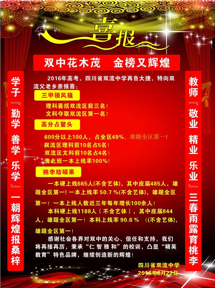 2016年高考,四川省双流中学再告大捷,特向双流父老乡亲报喜: