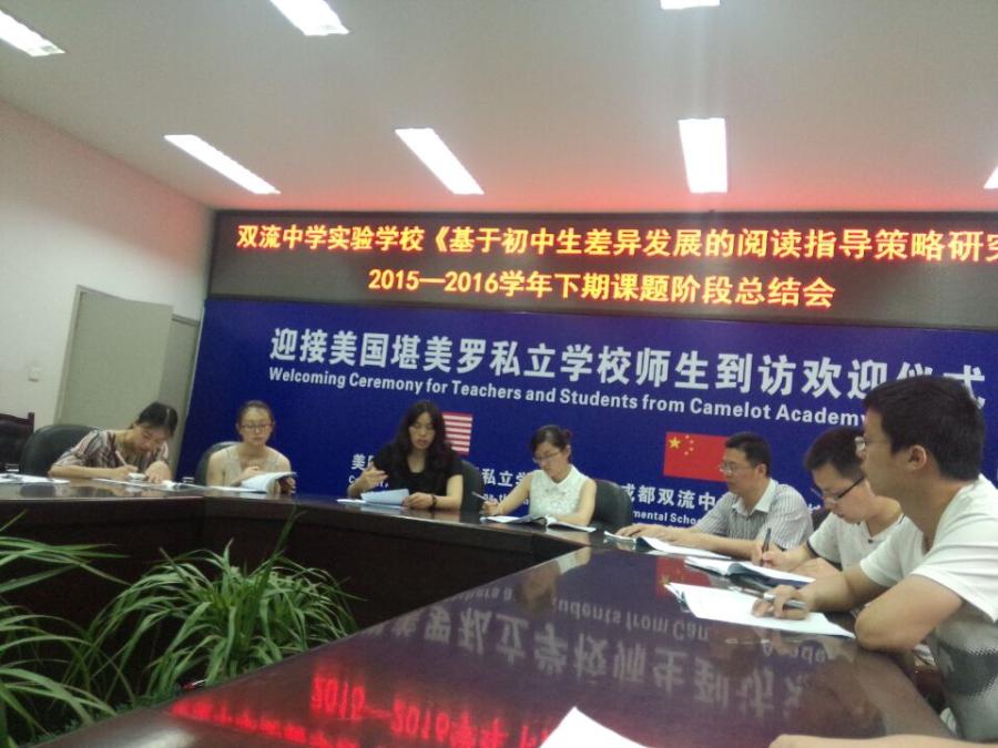 2016年6月22日,双流县教育科研课题《基于初中生核心素养的差异化阅读指导研究》和《四川省义务教育新课标背景下群文阅读推广与深化研究》之子课题《古代诗歌赏鉴的群文阅读路径研究》阅读课题组在学校三会议室召开了期末总结会。会议由课题组组长刘瑛主持。学校副校长张润林莅临并做重要讲话。张校长首先肯定了课题组一学期以来所做的工作,随后对课题中存在的问题予以了指导。针对阅读指导,张校长特别强调了个性化阅读指导与阅读兴趣的培养问题。随后,课题组副组长杨燕老师对课题组本期工作做了具体总结,对下期十月份的课题结题工作做了具体的安排和部署。