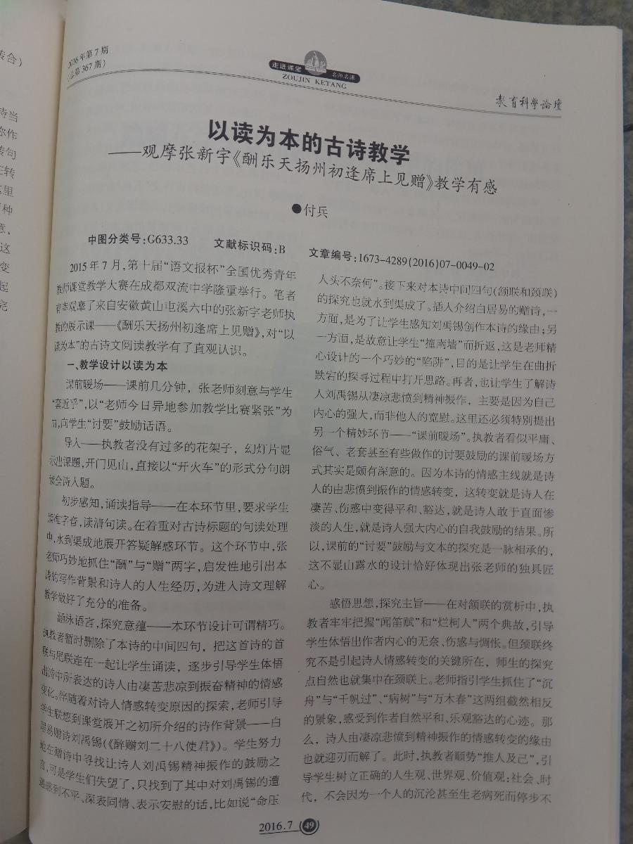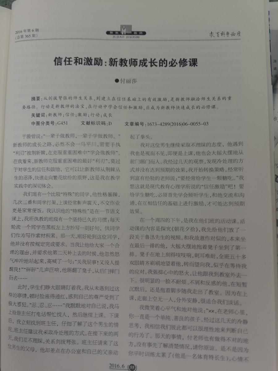 继星空在线登录官网语文组举行第一届“春芽杯”教科研论文比赛之后,语文组又陆续收获成果。何向老师的《中学生写作的歧与误》、付丽莎老师的《信任和激励:新教师成长必修课》、付兵老师的《酬乐天扬州初逢席上见赠》和《以读为本的古诗文教学》以及张薇老师的《对比:凸显孔乙己悲剧命运》等四位老师的五篇优秀论文分别发表在《教育科学论坛》【四川省教育厅主管,四川省教科所主办,中国核心期刊(遴选)数据库全文收录期刊】2016年第5、6、7、9期。