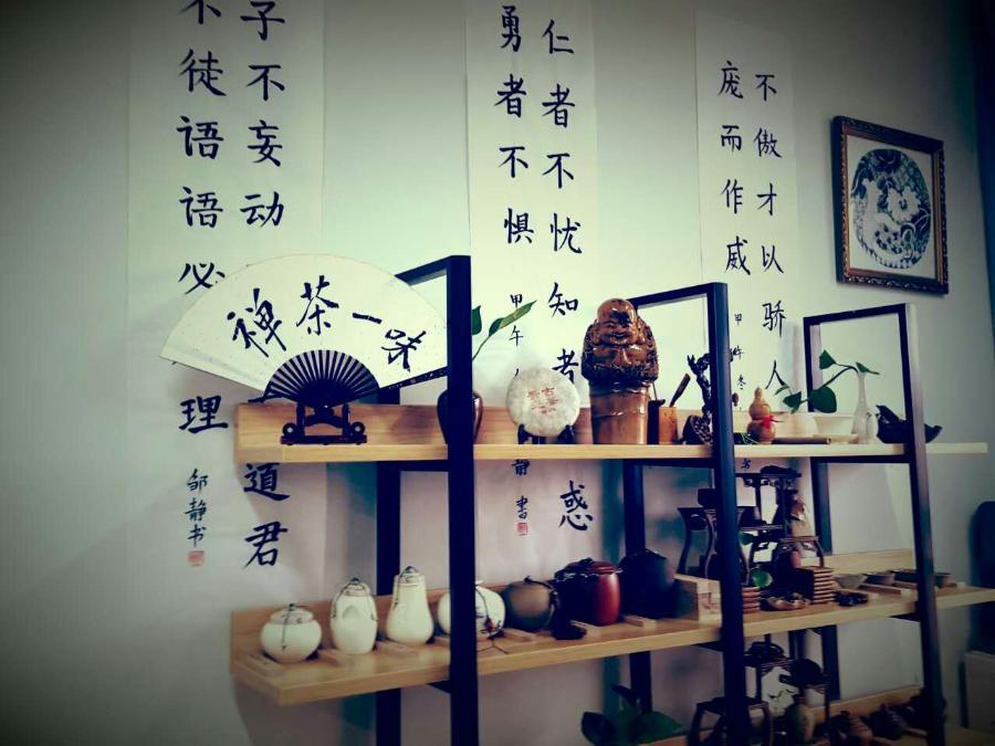 走进课题工作室,让我们由衷惊讶的是它别具一格的布置:首先映入眼帘的是摆满多肉、文竹、兰草的架子,不仅让人眼前一亮,也让工作室充满勃勃生机;旁边的小书架上,每一层都准备了不同的书籍,从最上一层的时下畅销书到第二三层的国学经典,总会不时迎来师生的借阅;工作室正中是可以容纳十多人的茶桌,桌上茶盘、茶席、茶杯……每一个茶具都由师生精心挑选,在配上老师和学生自己培育的花生等绿色植物,让人情不自禁地想坐下来,品上一杯香茗;靠里的两侧分别是一个大木架,左侧的木架上整齐地摆放着各类茶壶、茶具,每一套都单独标注,既有利于提高学生的认识水平,也平添细节趣味,右侧的木架上整齐地排列着从2003年到2016年的《南风窗》、《看天下》及各类茶艺书籍,方便师生随时翻阅;墙壁上张贴着学生自己创造的字画,以及课题研究过程中的趣味图片……整个工作室茶韵禅韵十足,俨然传统“禅茶合一”的境界。当我们的指导老师告诉来访师生,这里原本是学校修建遗留下来的一处堆放杂物的地方,在课题开始后,由参与师生共同打造、手工打造,来访者无不惊叹不已。