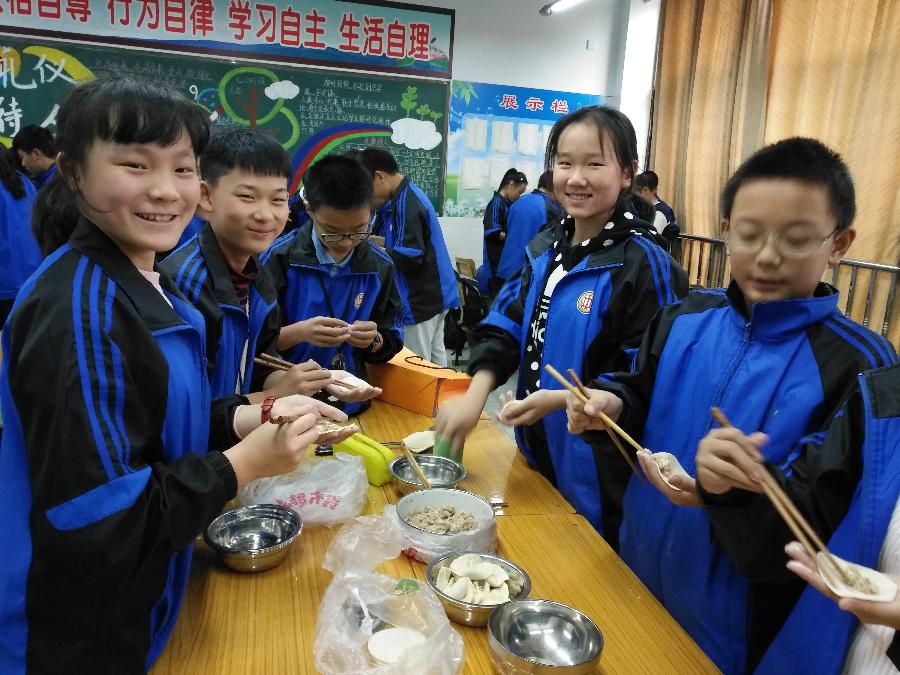 包完之后,班主任带领孩子们在教室煮饺子、吃饺子。细看,饺子的大小不一,形状也各异,但孩子们吃的真香!他们真正收获的不仅仅只是如何去完成包饺子这个任务,更为重要的是,要让他们体会到劳动的光荣和快乐。我们更鼓励孩子,回到家中亲手为父母包上一顿饺子。即使形状、味道不如餐馆里好,但父母肯定会为自己的孩子感到骄傲和自豪! (付丽莎)
