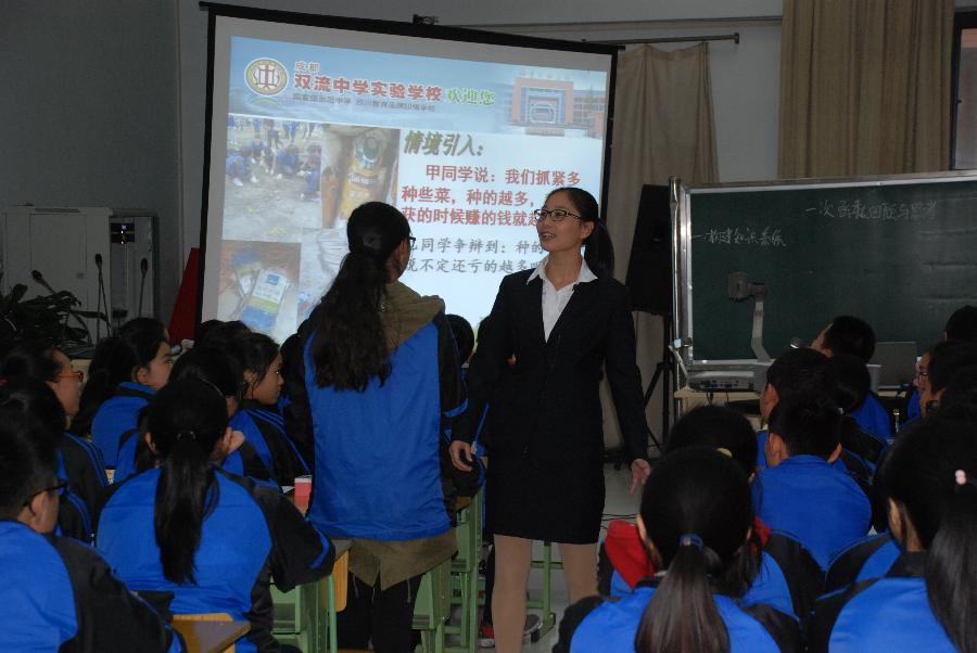 星空在线登录官网穆玲老师代表双流区“罗宗绪名师工作室”在大会中上展示课《一次函数》复习课,该课运用星空在线登录官网市级课题《自主合作探究式学科课堂教学模式》成果,在工作室导师罗宗绪的指导下,参照我校复习课课堂教学模式进行设计,通过复习让学生整理、重构,使本章所学纳入知识结构中。