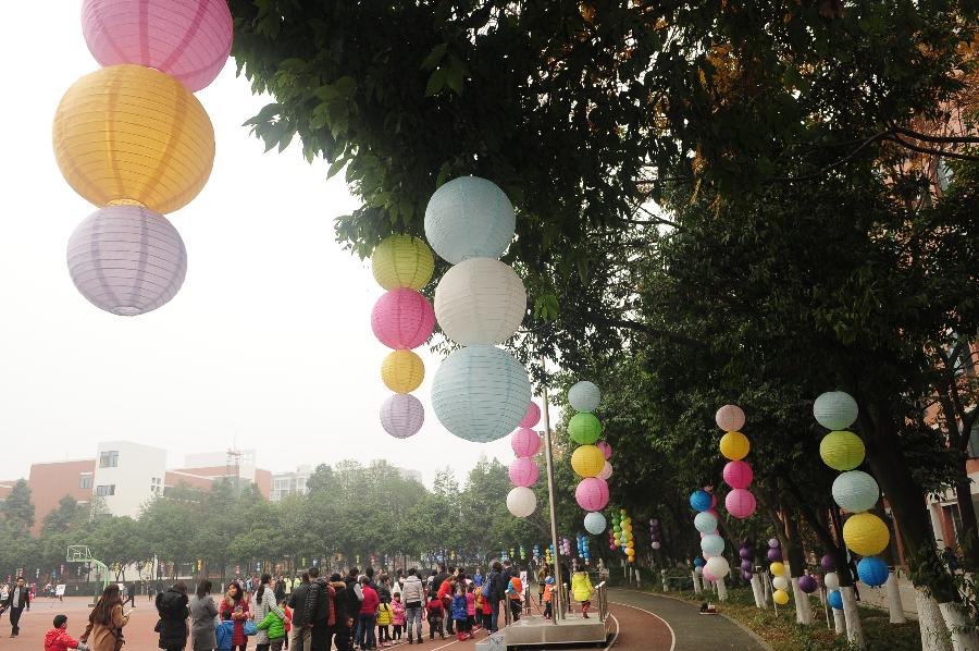 各种喜庆的的灯笼高高挂在树枝上,五颜六色的彩带随风飘扬,萌萌的卡通气球营造出童话般的世界,让冬日的校园增添了无限的暖意。