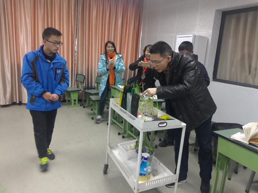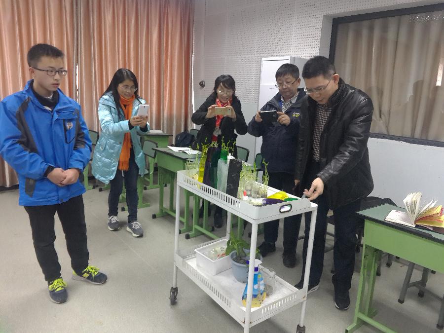 罗院长、史所长一行首先观看了学校课改成果展板,罗晓章主任为各位专家介绍我校近年来所取得的课改成果,尤其介绍了我校综合实践活动课程开发与实施的研究近况及其产生的较为广泛而深远的社会影响,让专家们啧啧称赞。随后,专家一行来到八年级十七班教室,李举梅老师正在组织学生进行彭镇种植探究活动汇报。课堂上,学生们分组汇报展示他们在彭镇种植基地参与的“豌豆发芽条件对比探究”“色光对莲花白生长的影响探究”等活动。孩子们团结合作,分工明确,他们严谨的研究态度、科学的实验方法、细致的观察记录、流利的语言表达无不显示出他们的智慧与灵性。专家们情不自禁的离开座位,走到学生小组之中拍照、互动。课后,专家们为孩子们报以热烈的掌声,罗清红院长对着孩子们竖起大拇指。