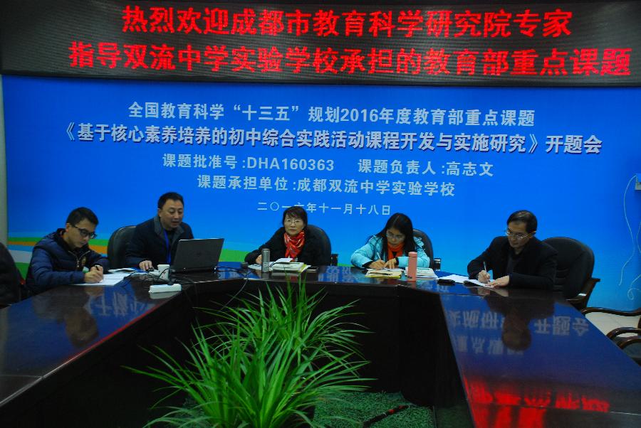 2016年12月28日下午,成都市教育科学研究院罗清红院长、成都市教科院教育改革发展研究所副所长、《成都教育》执行主编、成都市教科院中学综合实践活动教研员史玉老师,成都市教科院中学物理教研员卢山老师、《成都教育》执行副主编肖慧老师和双流区研培中心理论室易恩主任一行莅临成都星空在线登录官网调研指导综合实践活动课程的开发与实施。教育部重点课题《基于核心素养培养的综合实践活动课程开发与实施研究》课题组长、成都星空在线登录官网校长高志文,副校长张润林、教科室文传福主任、教务处周宗友主任、罗晓章副主任和综合实践活动课题组主研人员付兵老师等陪同。