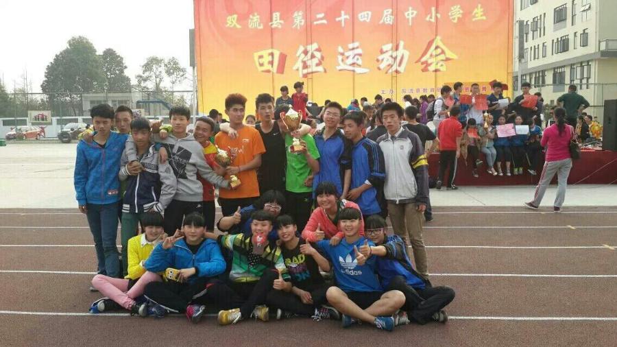 2014年3月27、28日,双流县第二十四届中小学生田径运动会在双流县艺体中学隆重举行,全县各中小学共39支代表队、500多名运动员参加了本次比赛。在运动会上,双中实验学校田径队员克服困难,顽强拼搏,团体总分以高出第二名200多分的巨大优势夺取了初中组甲组、乙组团体总分冠军共二项殊荣。