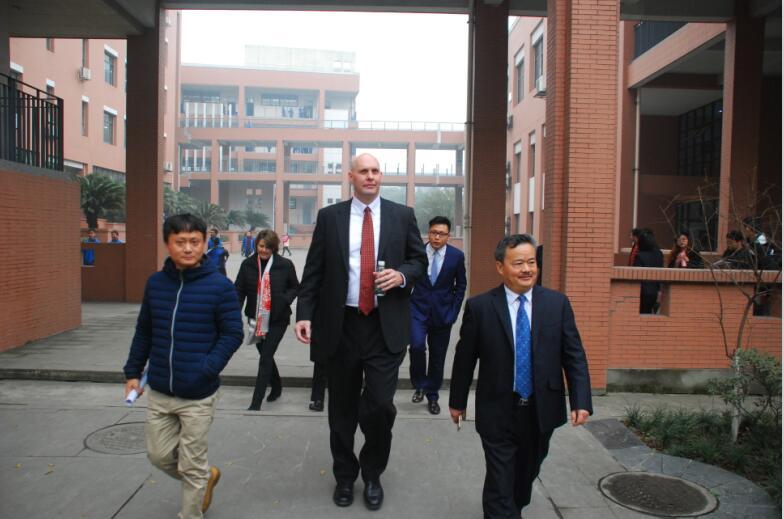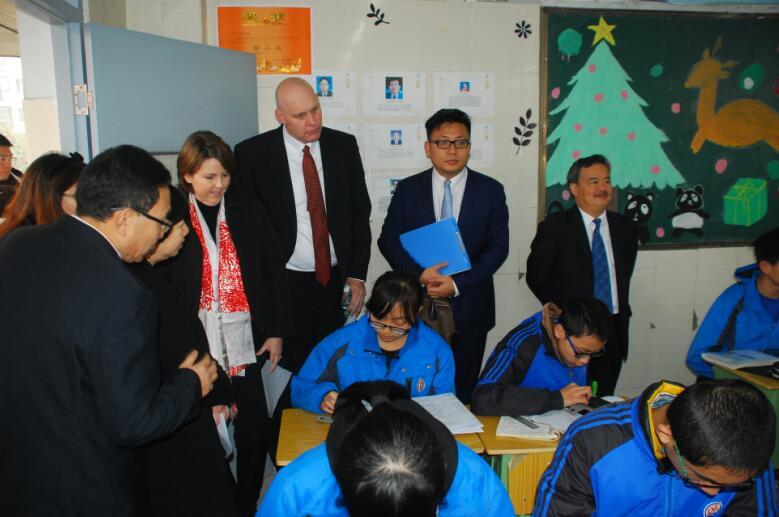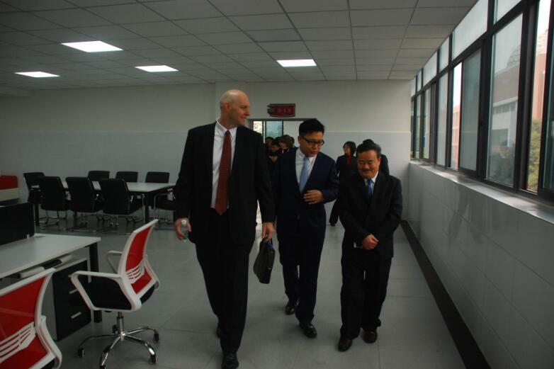 首先参观了正在建设并即将完工的国际高中部。参考美方一年前提供的课程内容和教学硬件软件要求,双中实验校参照美国圣乔治中学,为就读国际高中部的学生建设了“智慧教室”,该教室容纳学生20人左右,拥有独立的功能区,可以实现师生互动和现代化信息技术的运用。应美方课程要求,学生将开设烹饪课,这是综合素质课程中一门很重要的课程,可以锻炼学生的动手能力和独立生活的能力,学生们也会在实践中深刻体会中西方饮食文化的差异,为今后出国打下良好的基础。STEM课程是美方提供的另一个重要课程,STEM代表科学(science),技术(technology),工程(Engineering),数学(Mathematics),针对这一课程的要求建立了高科技含量极高的“梦想教室”。 我们与全球顶尖级的出版社Pearson合作,为学生和老师准备了丰富多彩的国内外书籍,旨在培养学生的阅读习惯,同时我们满足老师终身学习和“充电”的需求。科学实验室也是按照AP课程标准建设的。美方校长对学校提供的教学设施及环境十分满意并表示对办学前景十分乐观。
