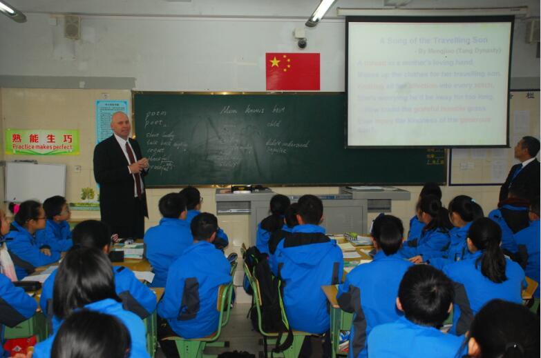 参观完国际高中部后,Jamie Tender走进了八年级的国际理解教育课堂。孩子们围绕主题Mom’s love展开了一系列的课堂活动。孩子们良好的语言能力和和活跃的思维能力给美方同行们留下了美好而深刻的印象。最后Mr. Tender走上讲台用一首美国诗歌与学生们分享了美国式的母爱。尽管语言是不一样的,但我们却有着人类相同的美好情感。