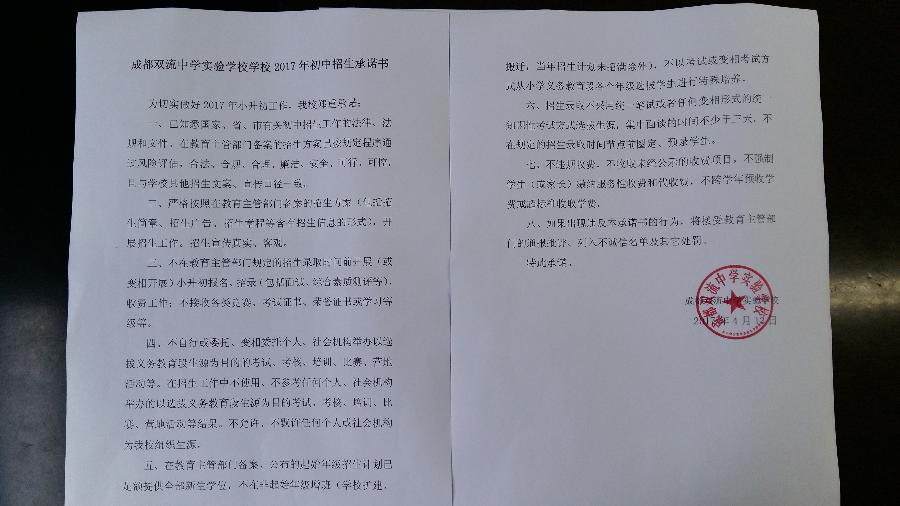 成都星空在线登录官网2017年初中招生承诺书