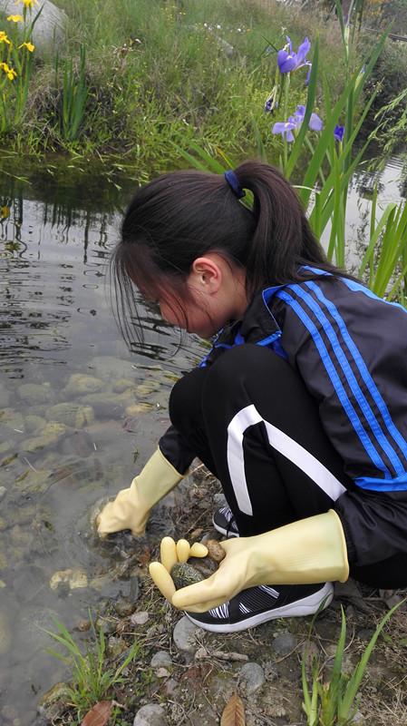下午,6:20,组员们将泥石,河水,水生植物放进玻璃缸中。最后,将研究对象——福寿螺,外壳洗净后放入,过程中,有一对福寿螺缠在一起,我们打趣道:竟然可以目睹福寿螺交配!这也证实了现在是交配产卵旺季, 接着,我们继续观察并记录。